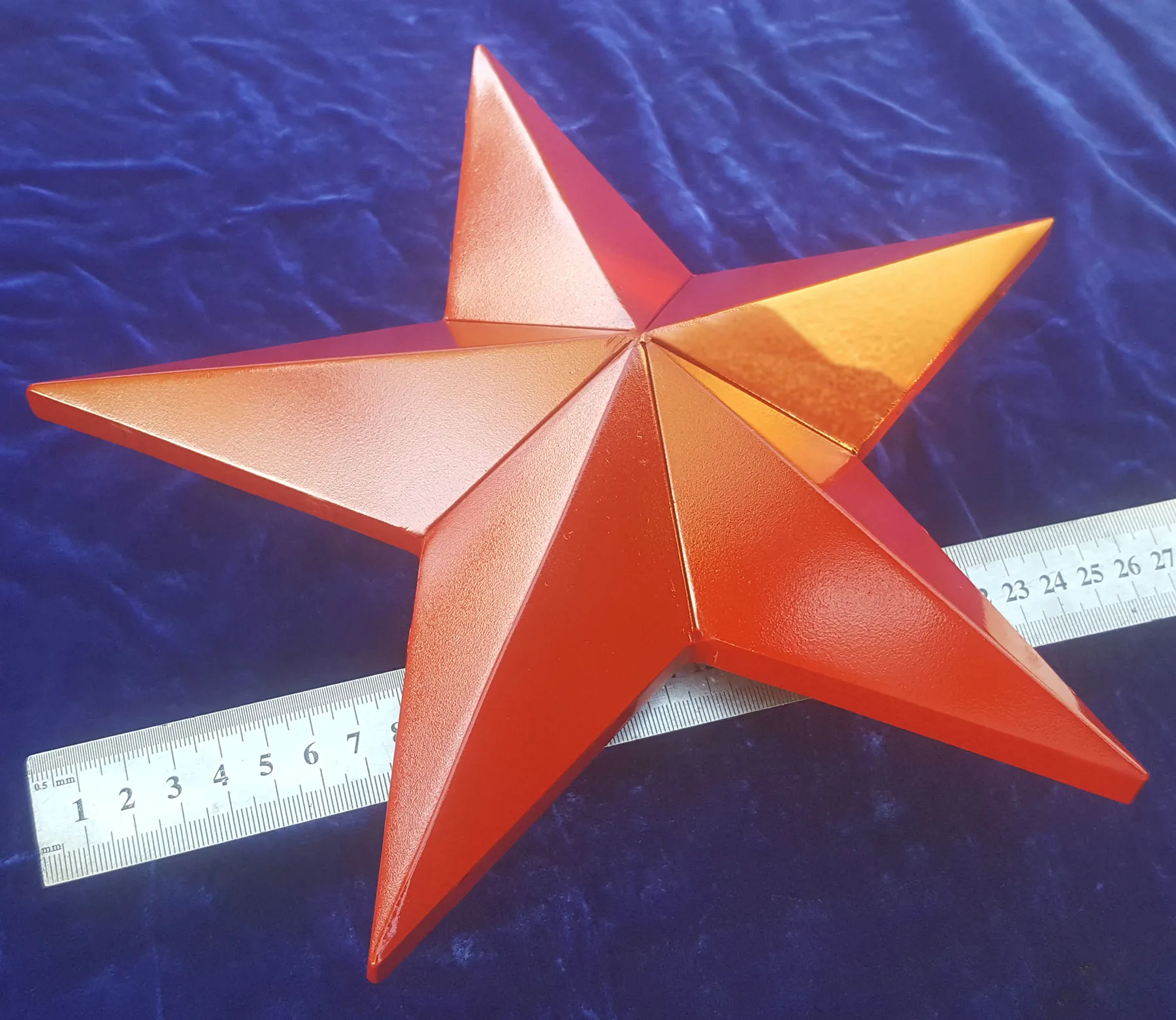 Звезда изготавливается из нержавеющей стали с последующим окрашиванием изделия в красный цвет. С тыльной стороны звезды имеются отверстия для крепежа изделия на тело обелиска. Толщина стенок изделия от 1 до 3 мм. Диаметр звезды согласовывается с заказчиком, он может быть разным, от маленького 100 – 150 мм., до огромного 1500 мм. Звезда на памятник рассчитана для эксплуатации в любых климатических условиях. Изготавливается звезда на заказ в любом оттенке красного цвета.